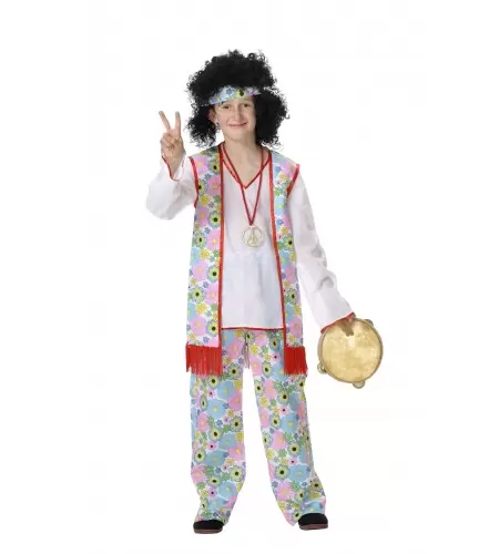 Hippie Kinderkostüm in Größe 6 und 10 hergestellt. Lieferumfang: Weste mit Fransen,Schlaghosen,Hemd und Stirnband.
