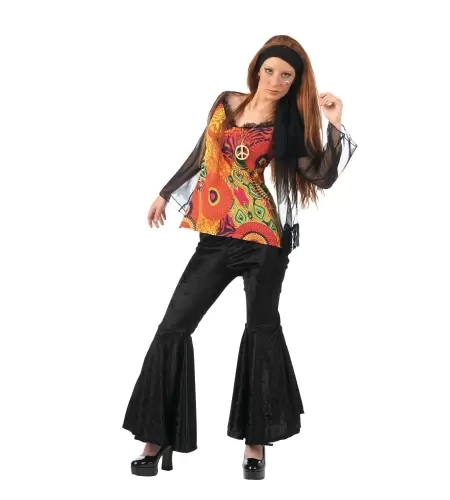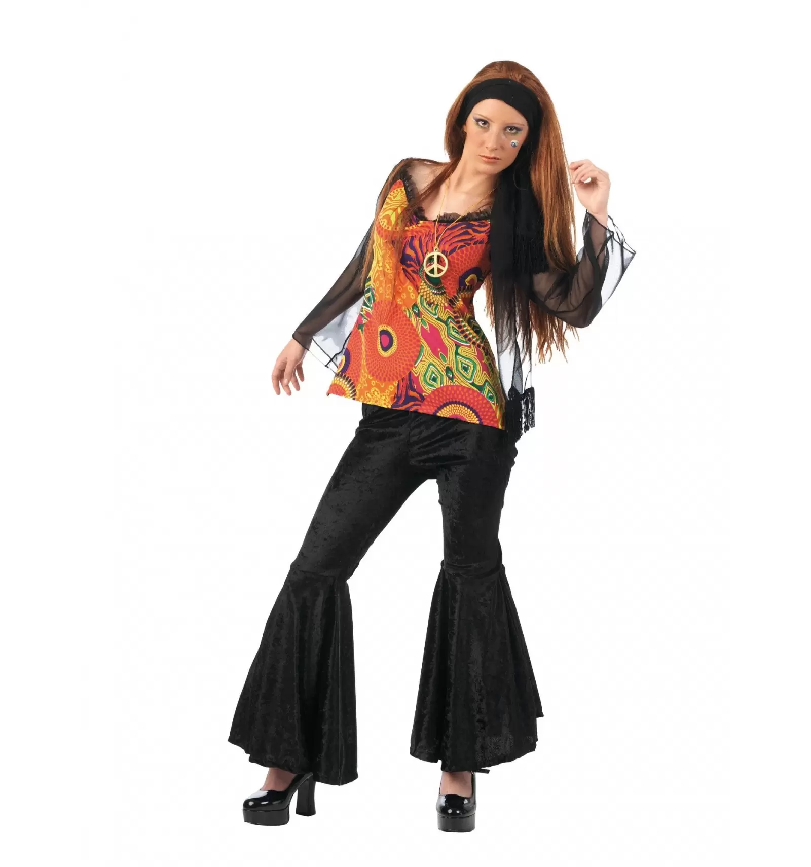 Hippie Disco Damen Kostüm. Lieferumfang: Bluse, Hose und Halstuch.