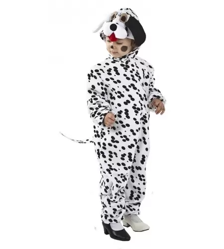 Dalmatian costume made of fine pyrenees fabric. for 6 and 10 year olds. includes one-piece and head. be part of 101 dalmatians with your classmates with this dalmatian puppy costume. perfect for school plays and carnival.