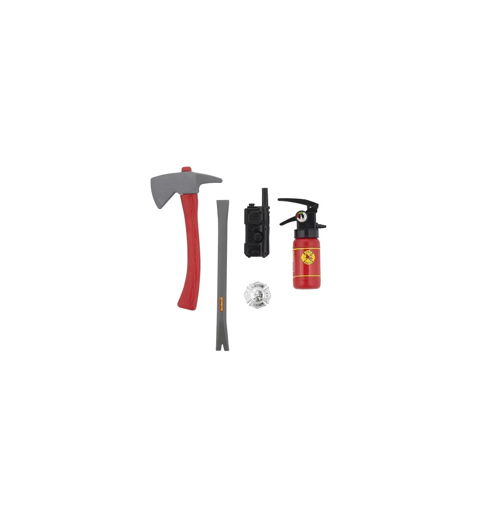 Firefighter set includes: helmet, axe, crowbar, extinguisher, walkie-talkie, and badge.