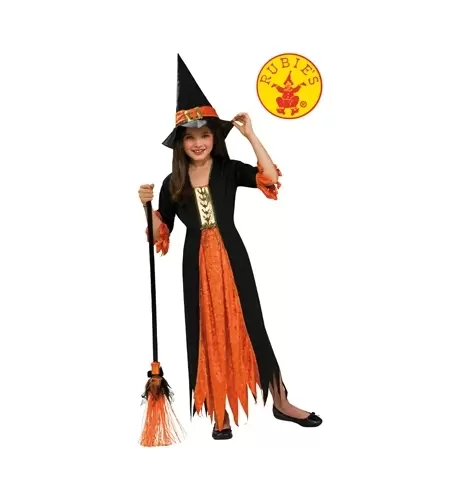 Colorful goth witch costume for girls in different sizes. includes dress and hat.