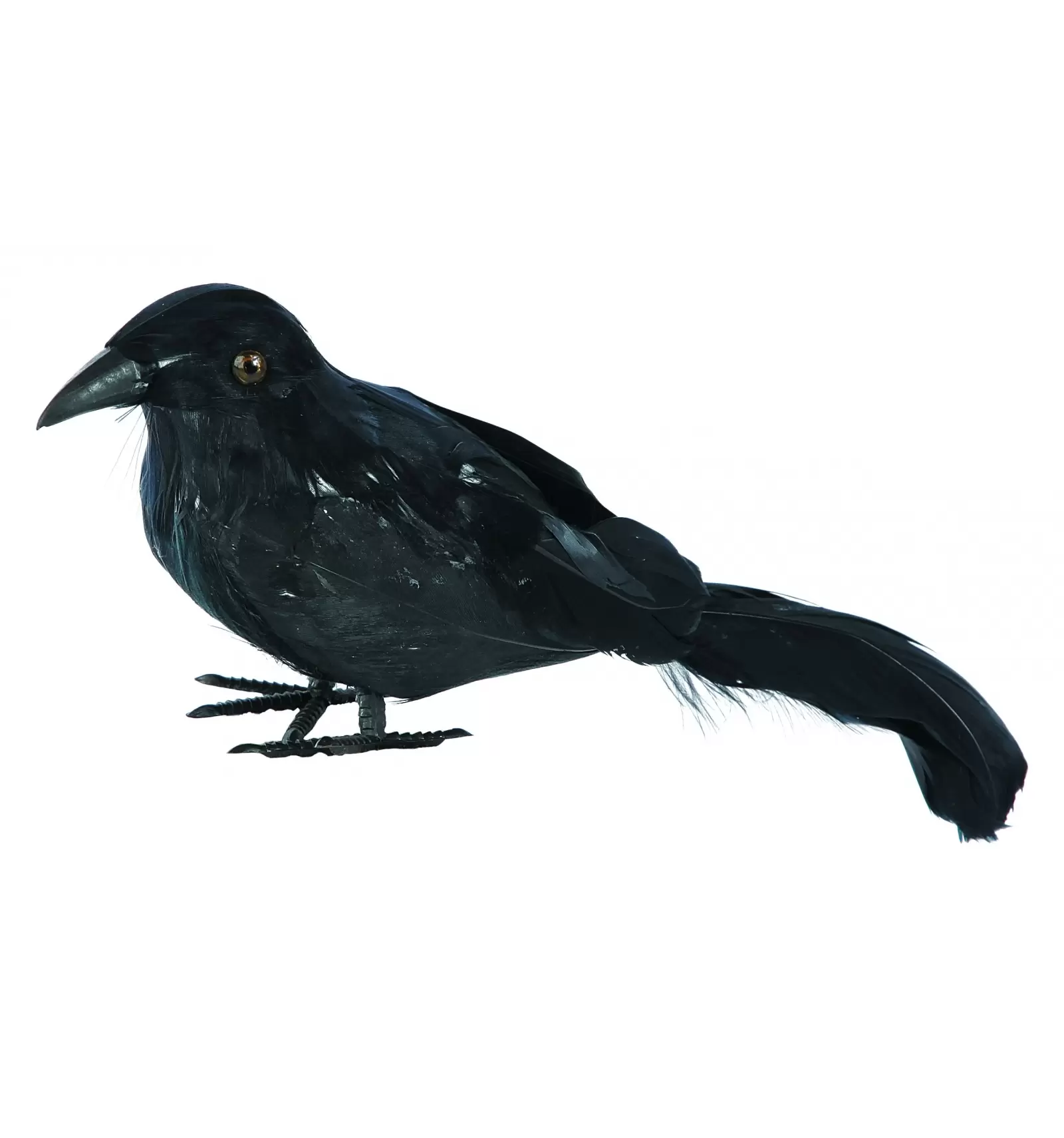 Large crow covered in black feathers. measures 22x6x9 cm.