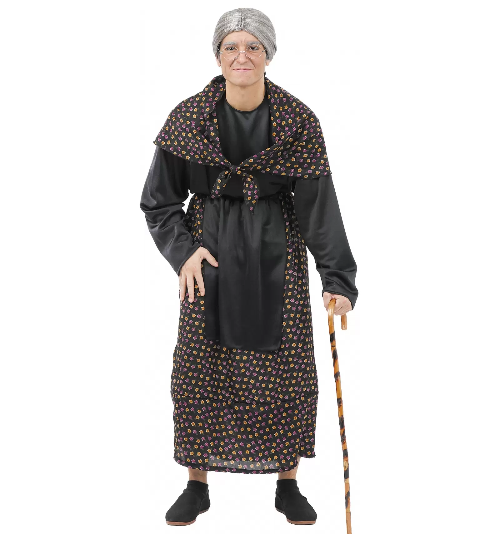 Old lady costume. Included in delivery: scarf, blouse and skirt with apron. Sizes: 44 for ladies and 52 for men.