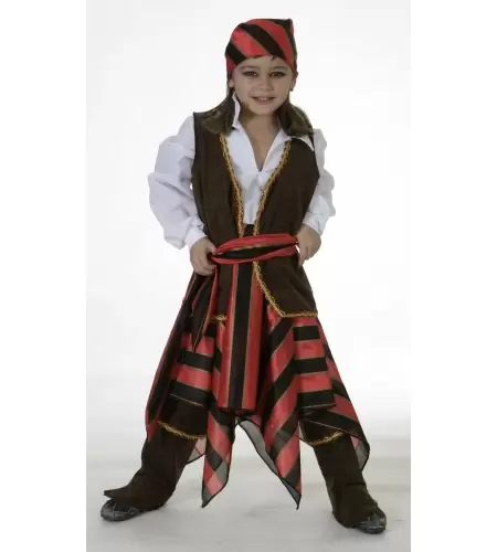 Corsair girl costume in sizes 4,6,8 and 10. Included in delivery: trousers, headscarf,blouse, vest, belt and boot tops.