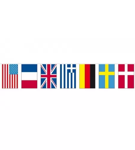 El paquete contiene: 50 metros de cinta con formatos de banderas de países internacionales cosidos a la tira. El formato de la bandera tiene una medida de 15 x 20 centímetros. Para pedidos en cantidad consultar presupuesto. ¿Esta tira de banderines surtidos en papel no es el artículo de decoración que necesitas?