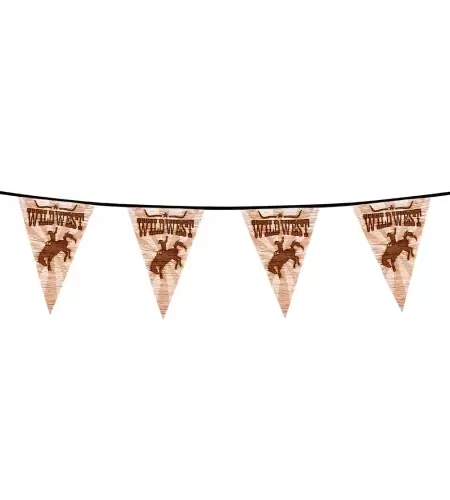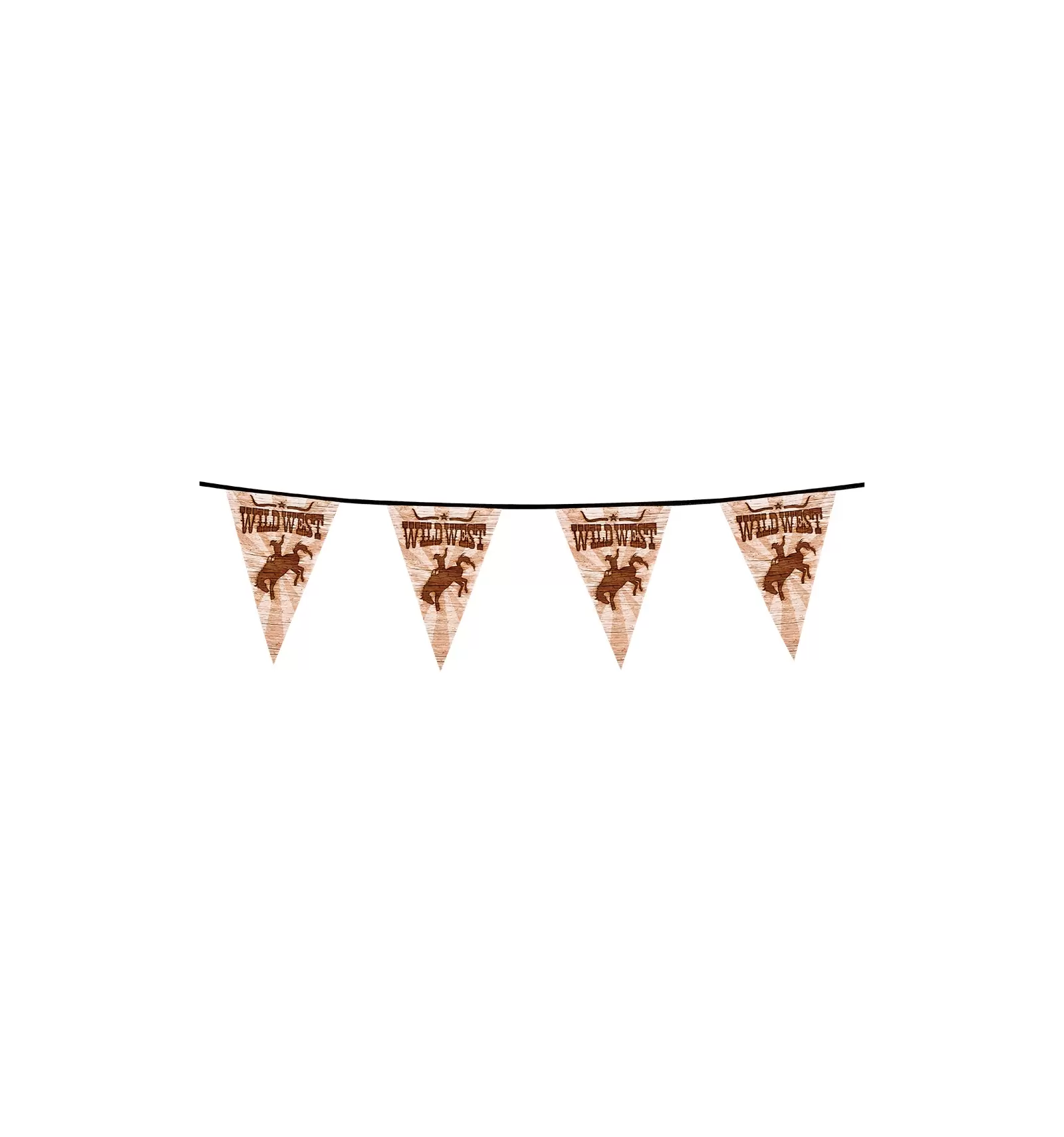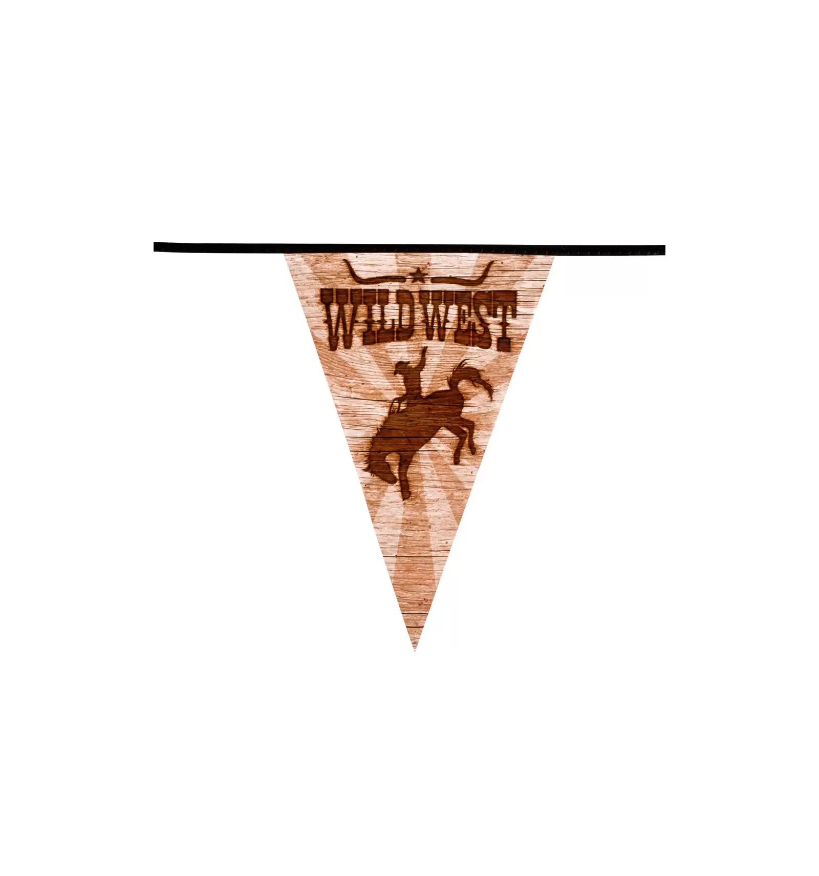 Te presento el nuevo gallardete farwest que hemos añadido a nuestro catálogo e accesorios de decoración. Estas banderas triangulares con temática del viejo oeste aportarán a tu fiesta el acabado que buscas.