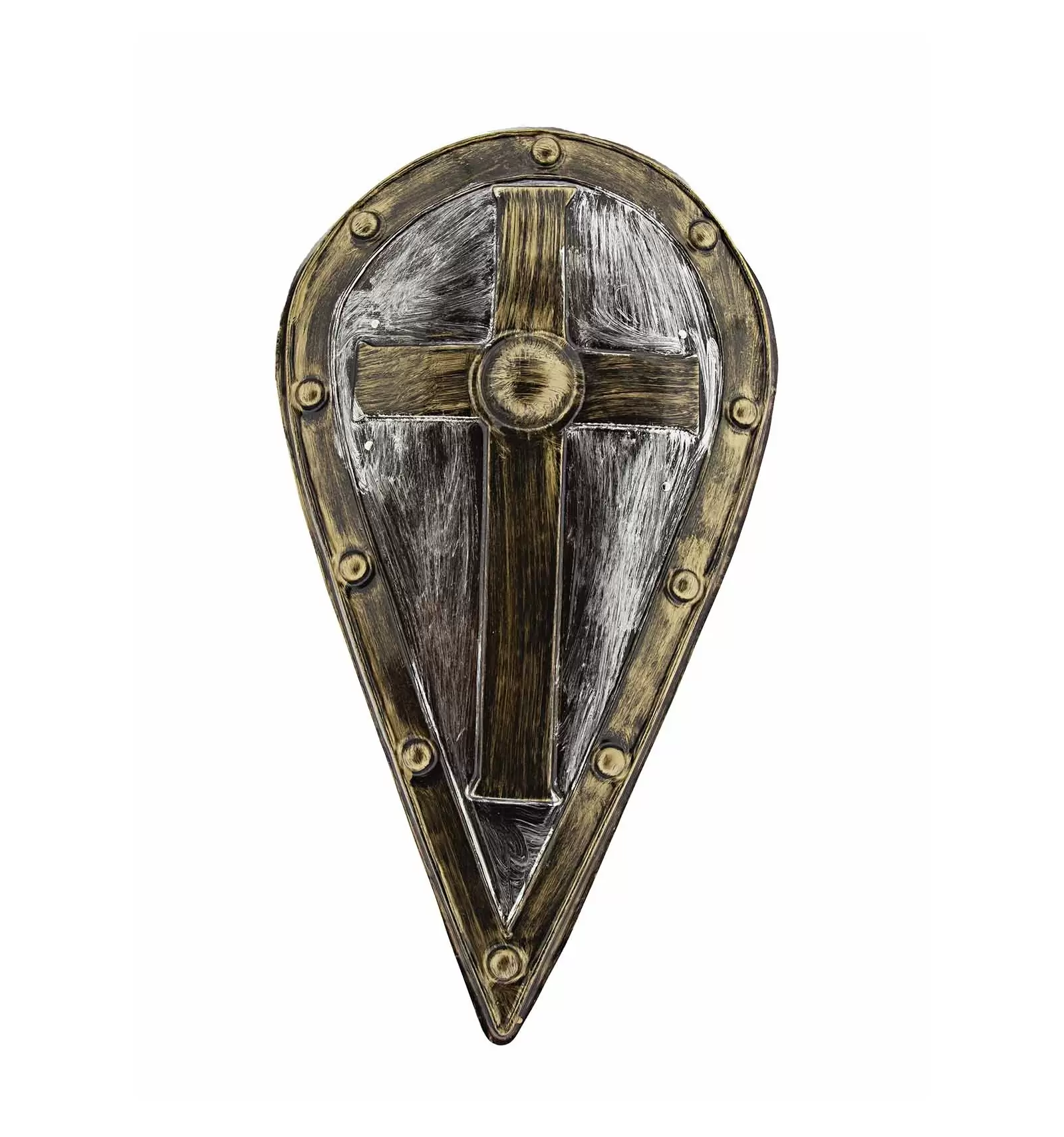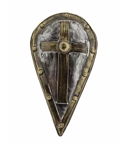 El producto incluye un escudo medieval lagrima, fabricado en plástico, cuyas medidas son 75x45cm.