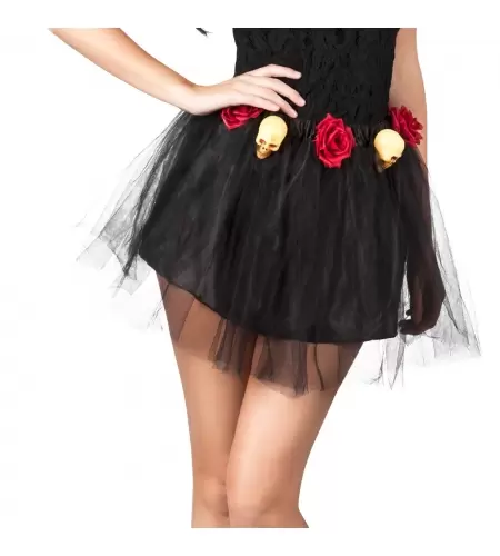 El producto contiene: Falda tipo tutú decorada con flores y calaveras de colores.