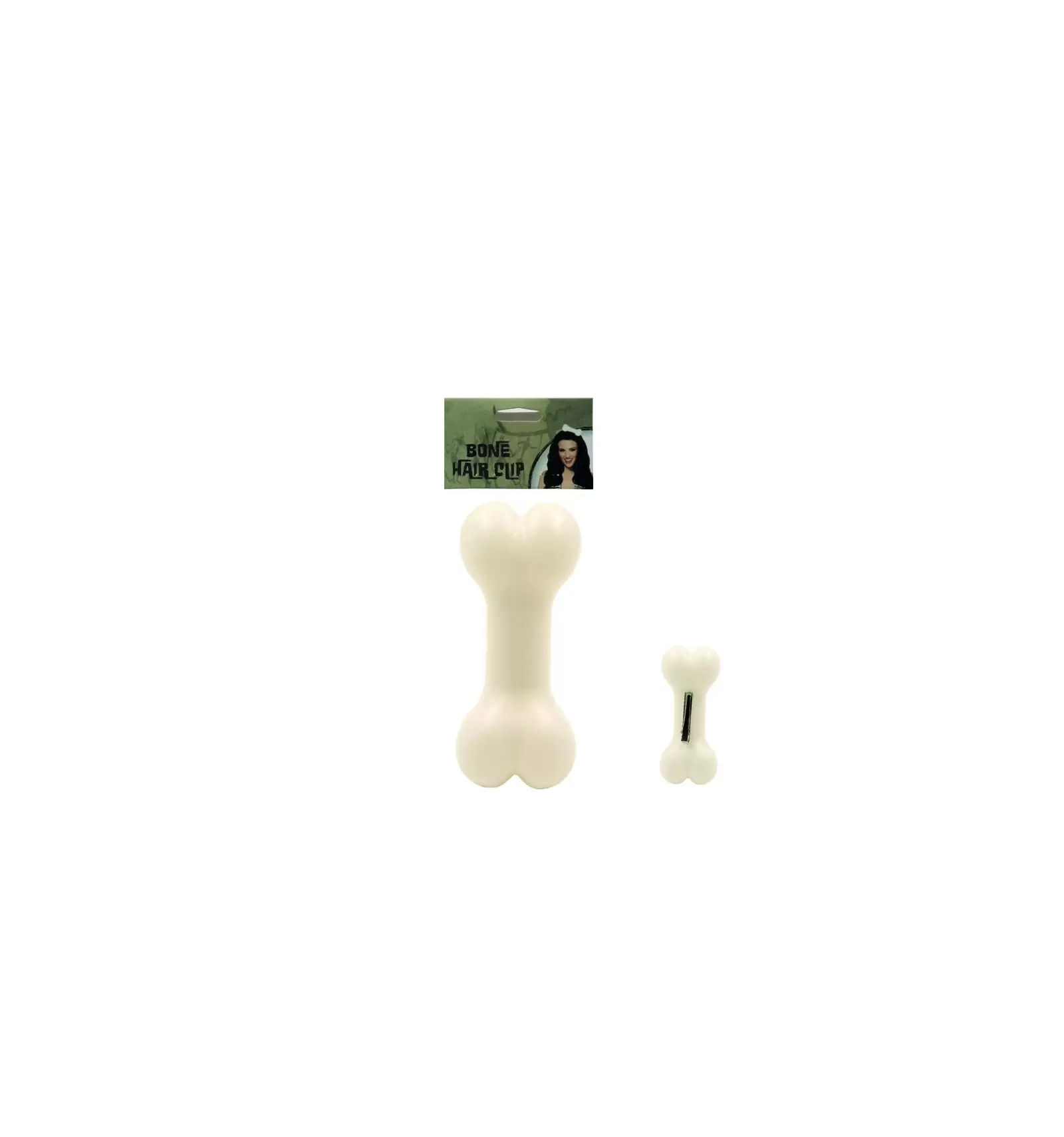 Hueso de plástico pequeño de 14 cm. de longitud, se sujeta a la cabeza mediante un clip.