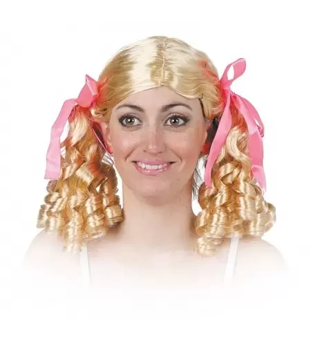 El producto contiene: Peluca con coletas de tirabuzones, cintas rosas y malla interior para adaptar a la cabeza.