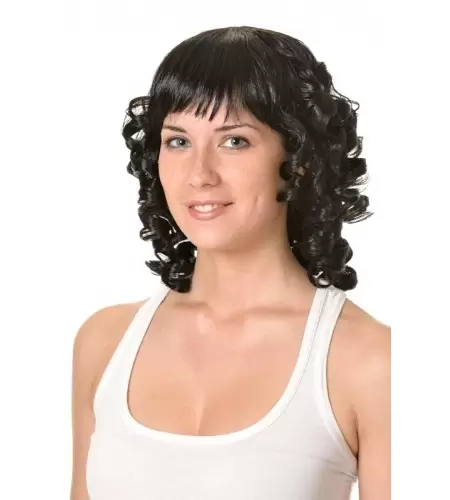 La peluca negra con tirabuzones y flequillo que ves en la imagen es un nuevo modelo que hemos añadido a nuestro catálogo y será un complemento ideal para caracterizarte en tu próxima fiesta de disfraces.