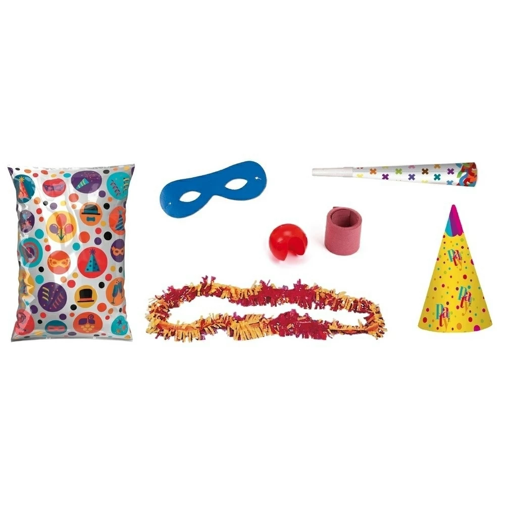 Contenido de cada bolsa: 1 Sombrero Rainbow, 1 Trompeta Impresa Piruli, 1 Collar Plástico 90x7cm., 1 Nariz Payaso, 1 Antifaz Corriente Impreso, 1 Serpentina 5 rollos. Medida: 31x42 cms. Caja 100 uds.