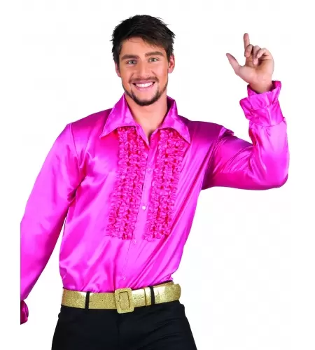 Este nuevo complemento camisa rosa con chorreras para adulto está disponible en un solo tamaño y será un accesorio ideal para cualquier fiesta de disfraces.