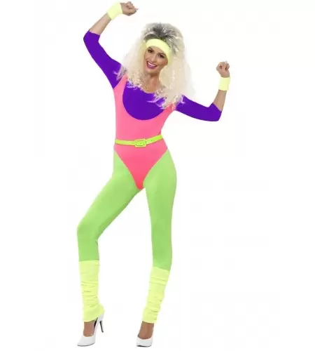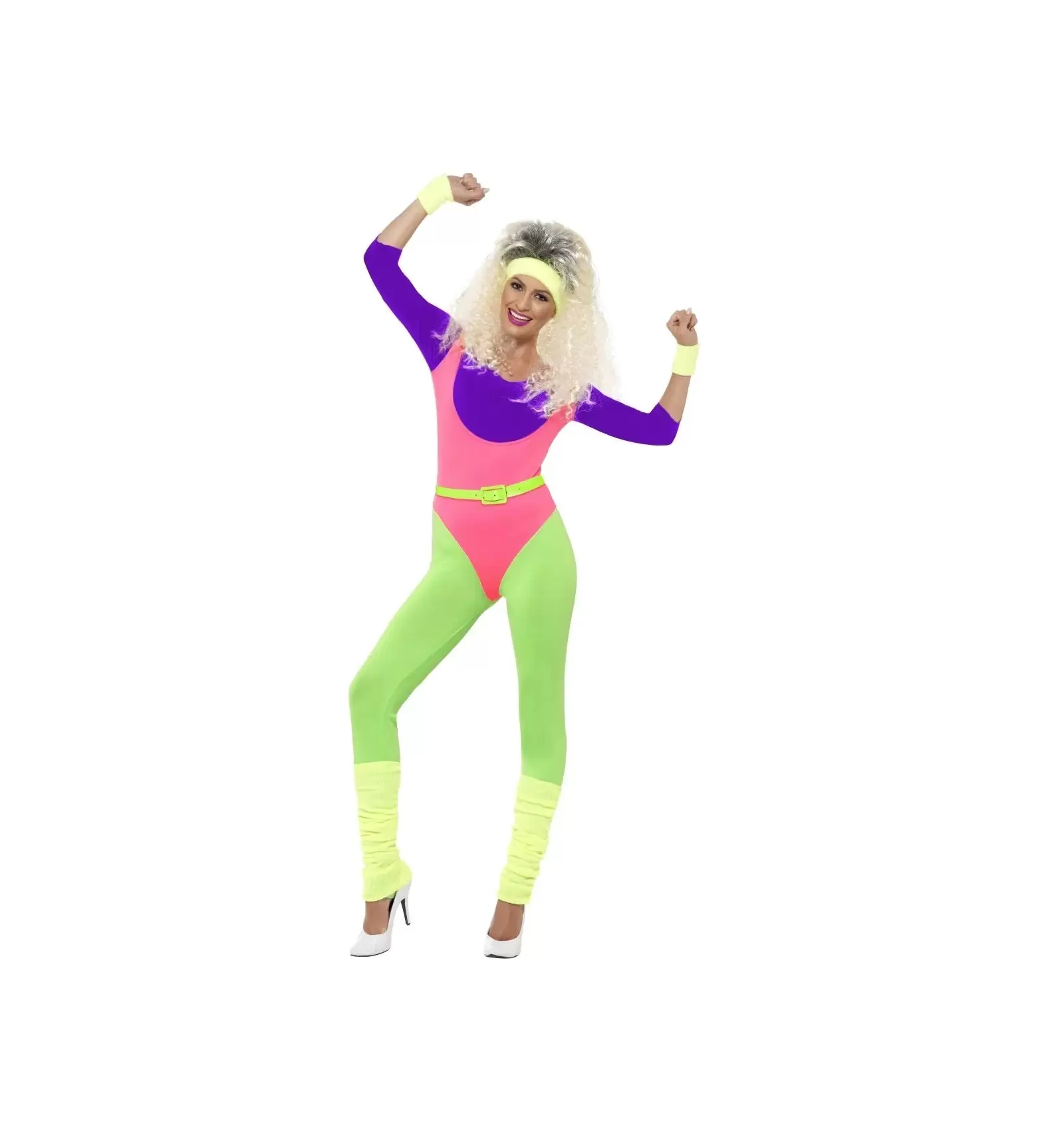 Este disfraz deporte años 80 adulto incluye mono, diadema y muñequeras.