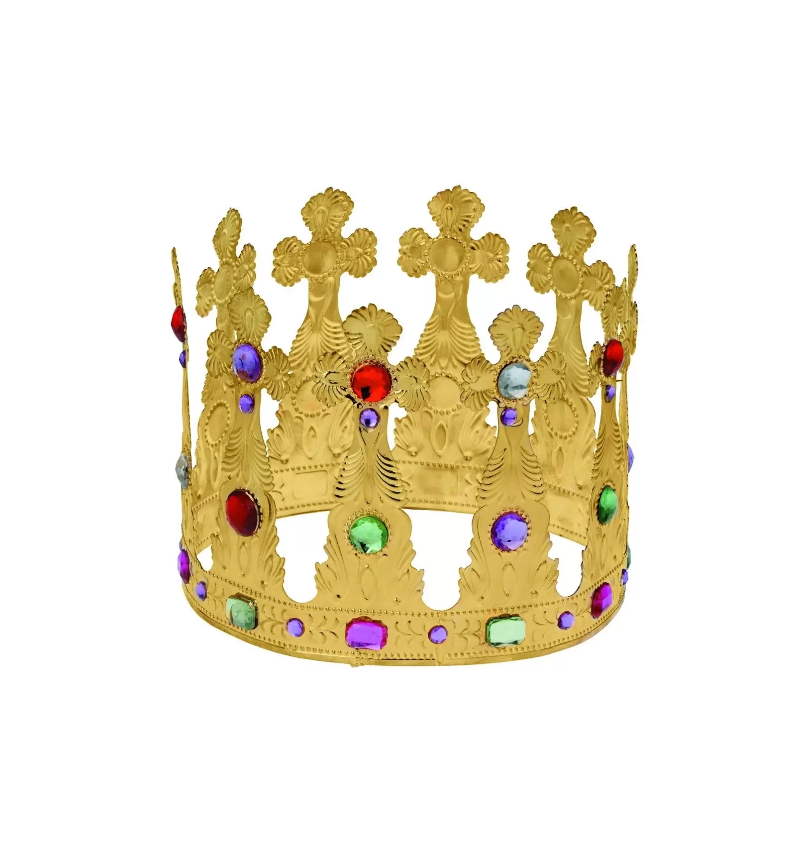 Una reina no puede quedarse sin su corona y un rey tampoco, por eso en Comarfi te traemos estas increíble y lujosa corona de metal con grandes piedras preciosas incrustadas en el metal. ¡Hazte con este complemento ideal para completar tu señorial disfraz real!;/span>