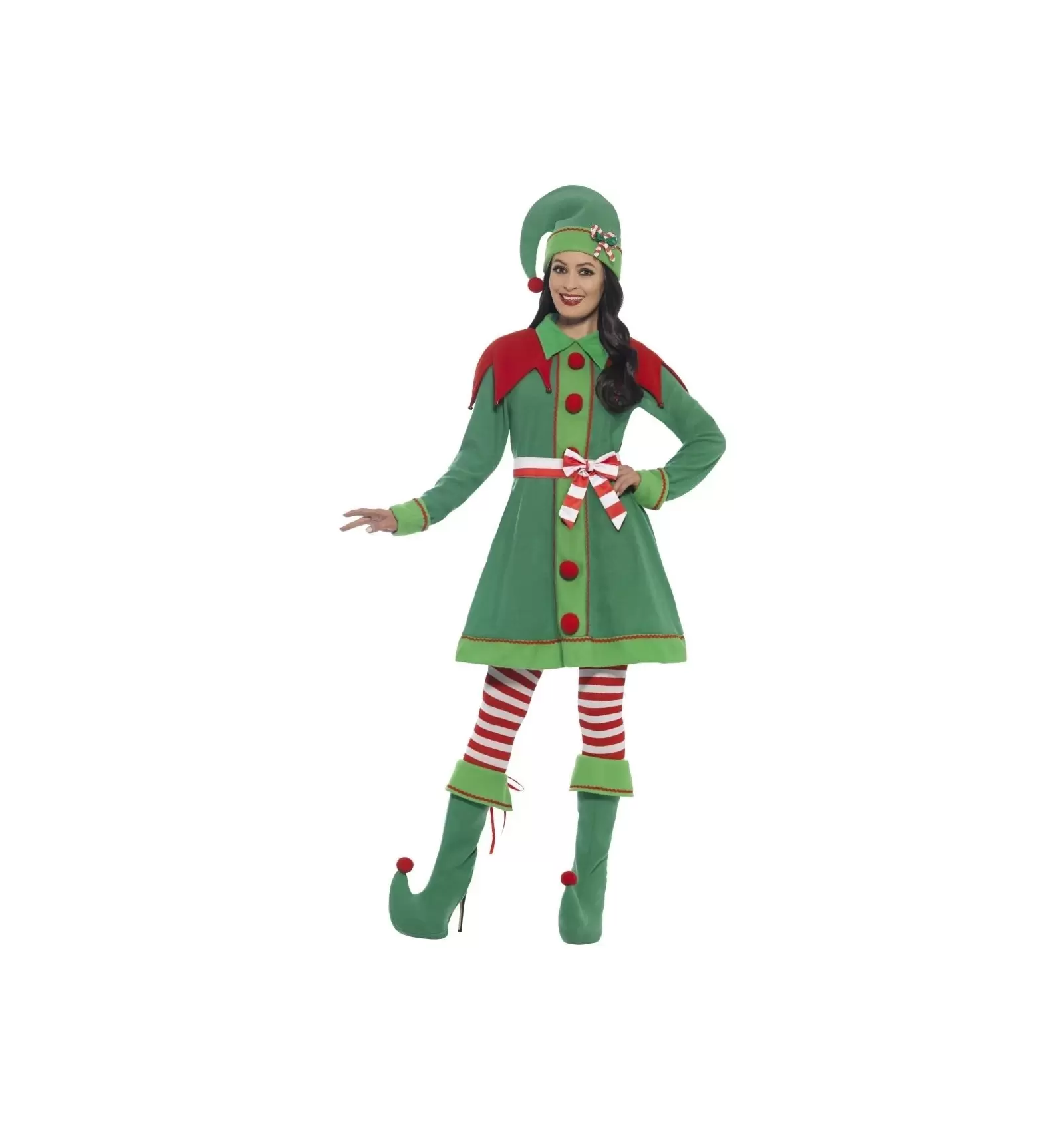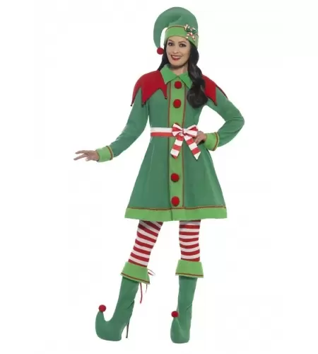 Este disfraz elfa verde lujo adulto incluye vestido, gorro, cubrebotas, medias y cinturón.