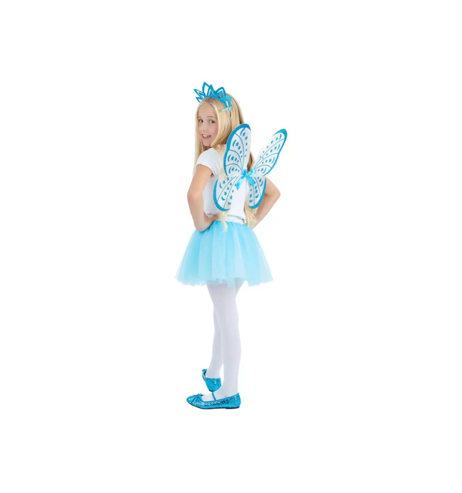 Este disfraz kit mariposa azul infantil incluye tutú, alas y diadema.