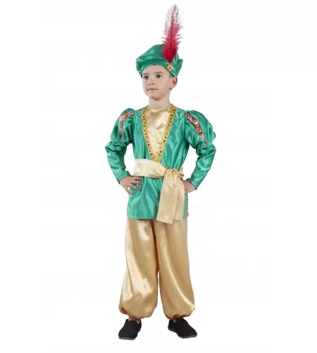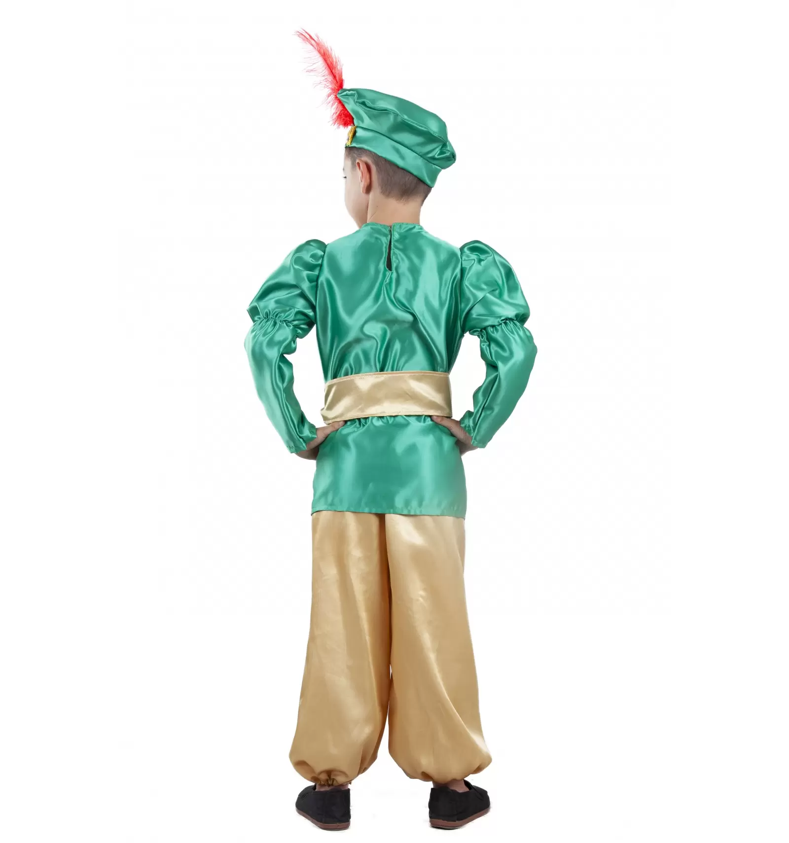 El traje contiene: Pantalón, camisa con detalles y gorro de paje con pluma.