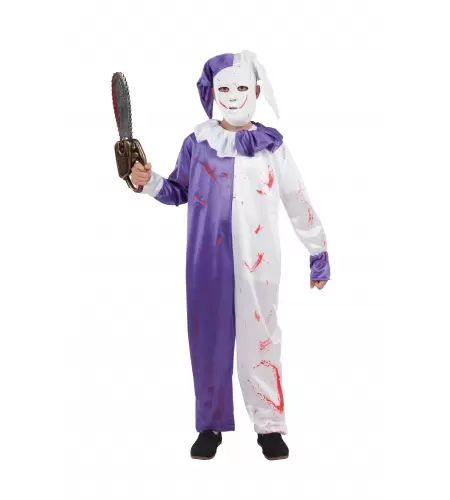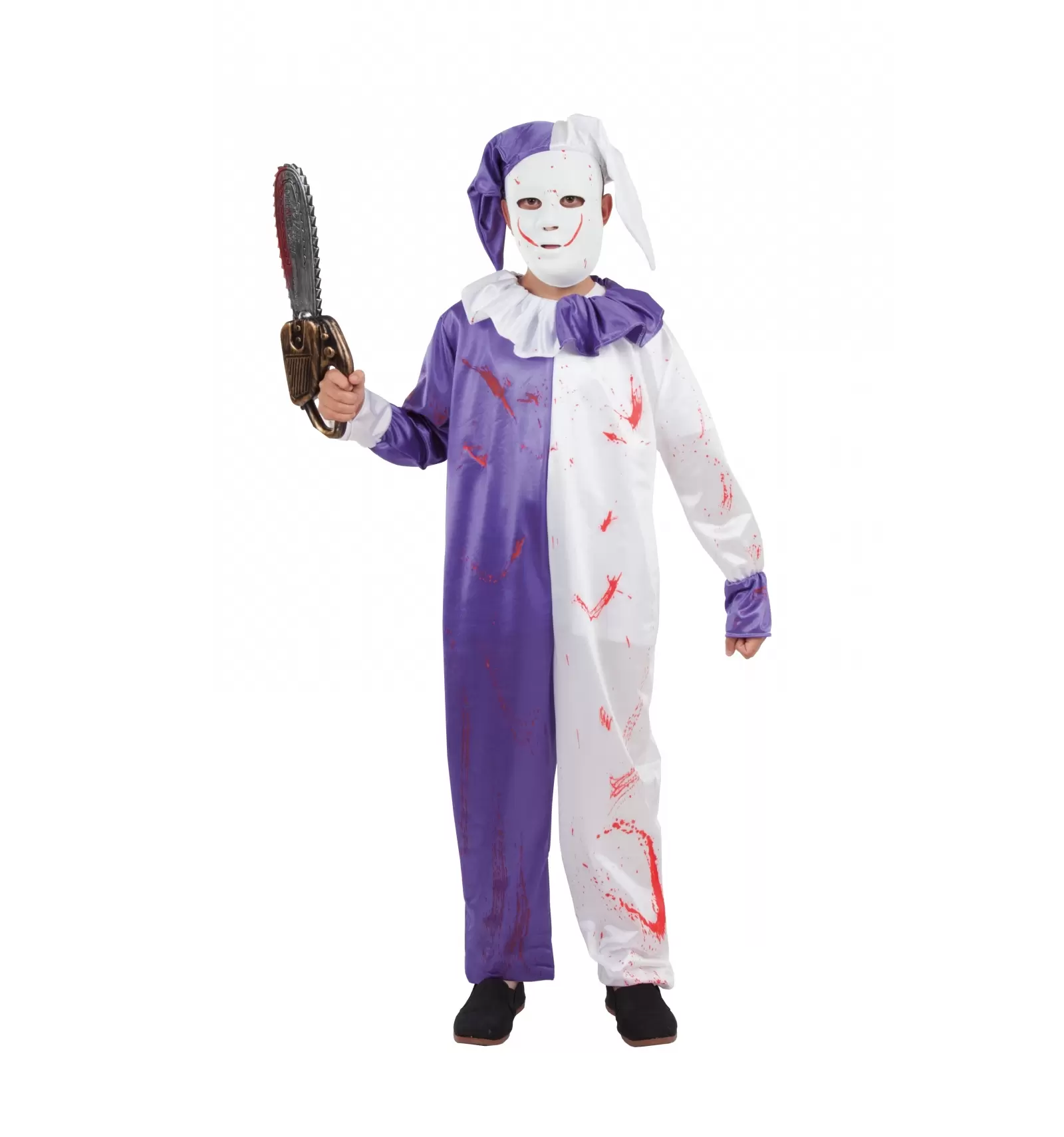 Este disfraz de payaso asesino para niño se encuentra disponible en tallas 6, 8 y 12 años.