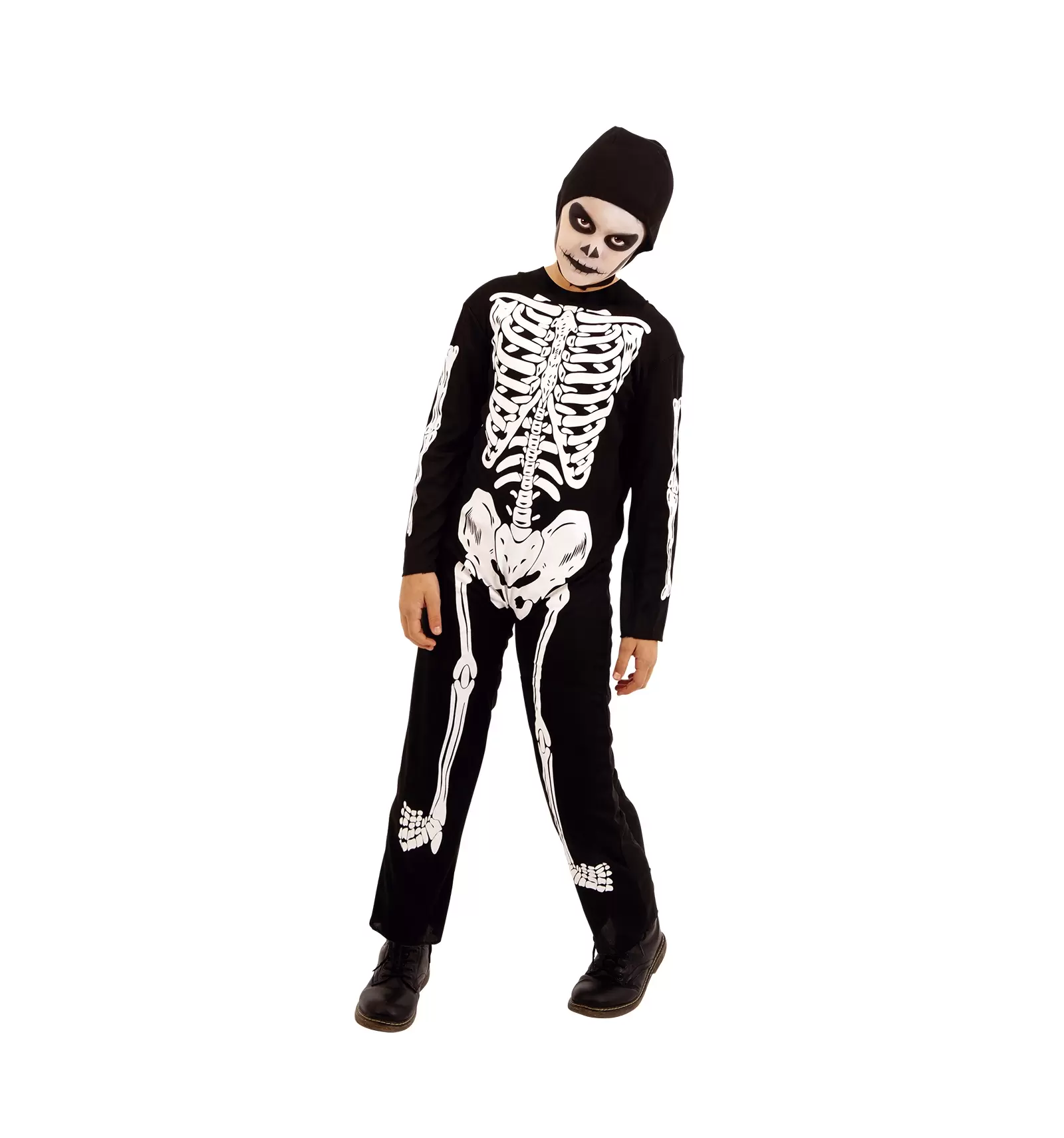 El disfraz de skelito infantil está fabricado de poliéster y está disponible en 3 tallas infantiles: S (3-4 años), M (5-7 años) y L (8-10 años).