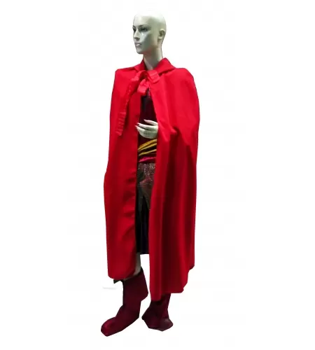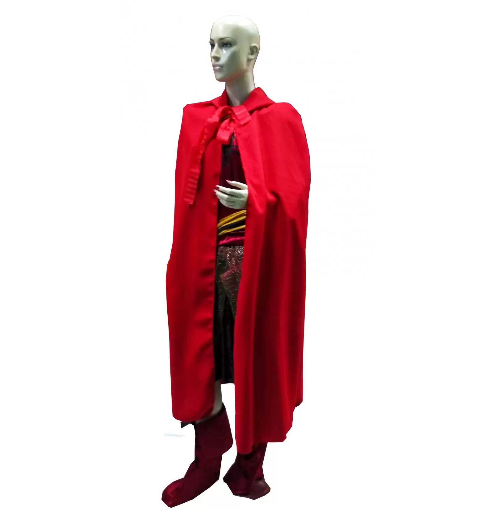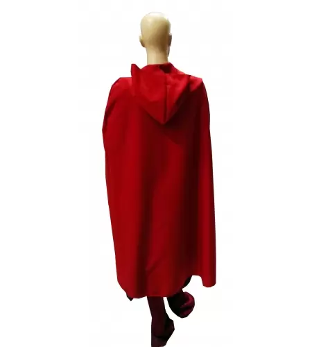Esta capa larga roja con capucha se encuentra disponible en dos tallas para adulto.