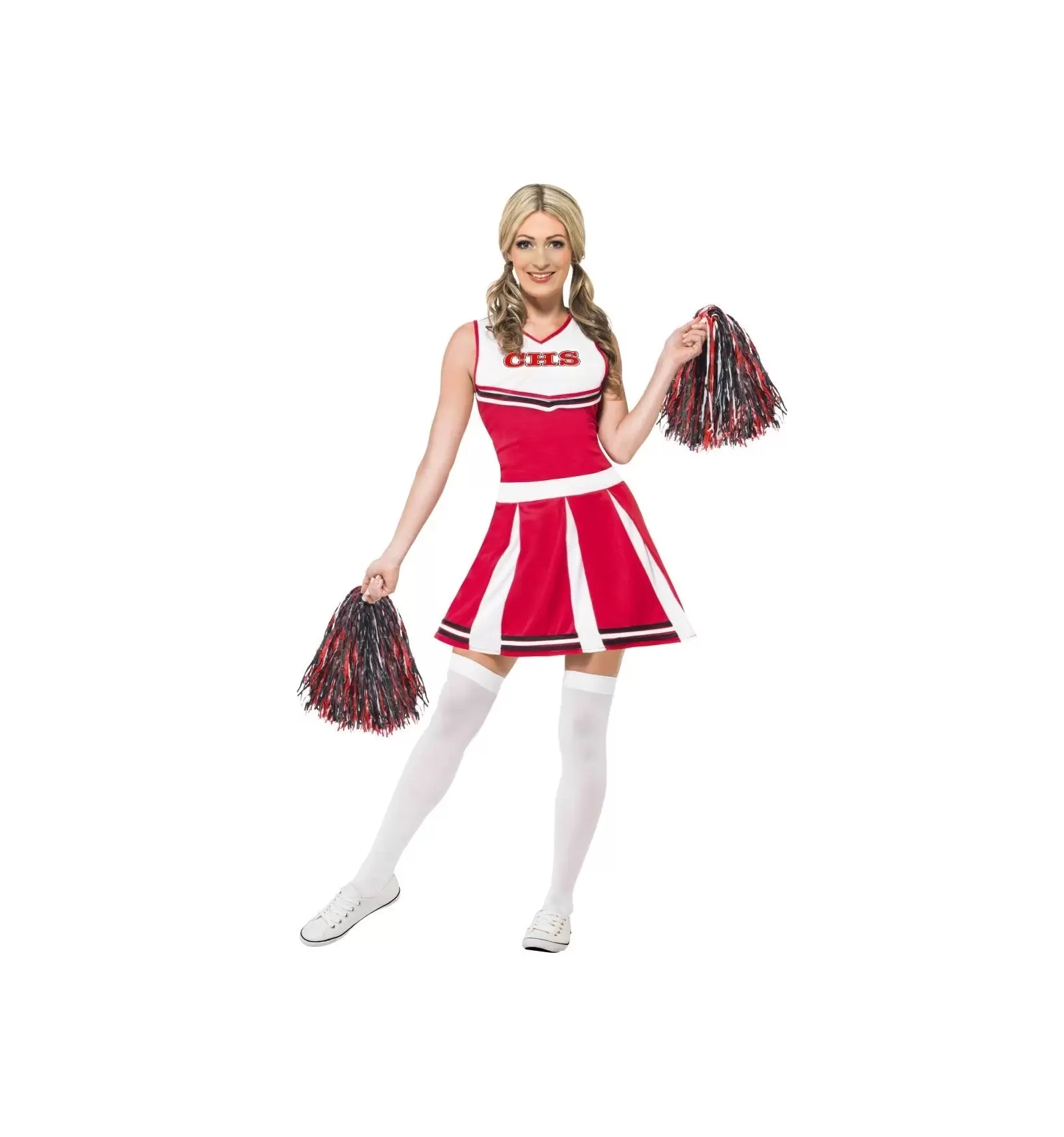 Este disfraz cheerleader adulto incluye vestido y pompones.