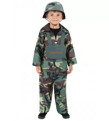 Este disfraz chico del ejército infantil incluye el traje completo y mochila.