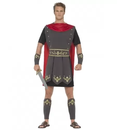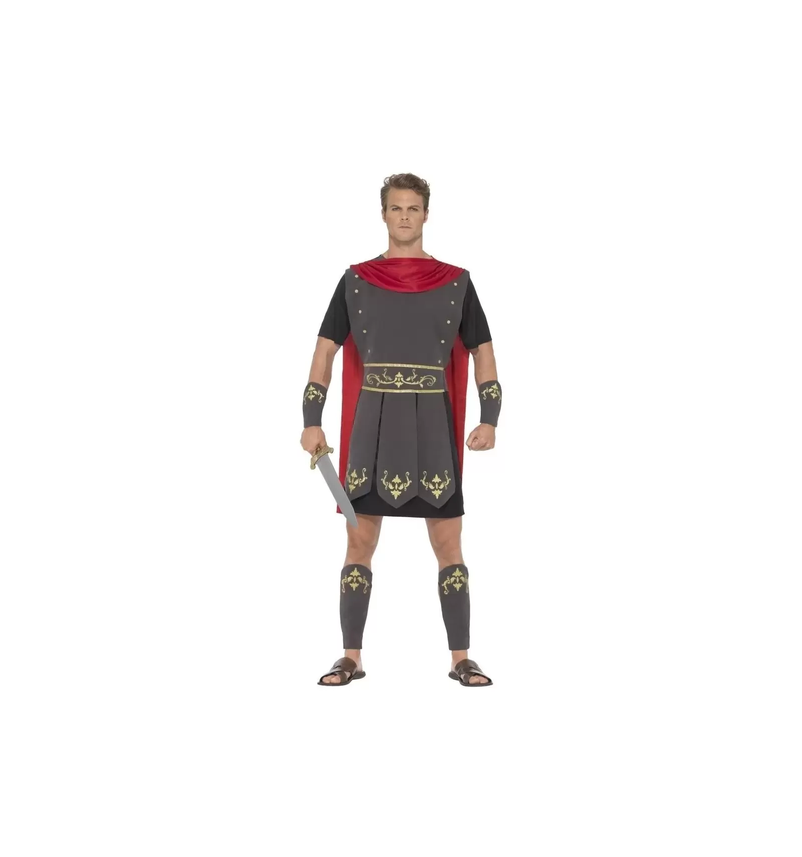 Este disfraz gladiador romano adulto incluye túnica, capa incorporada, brazaletes y espinilleras.
