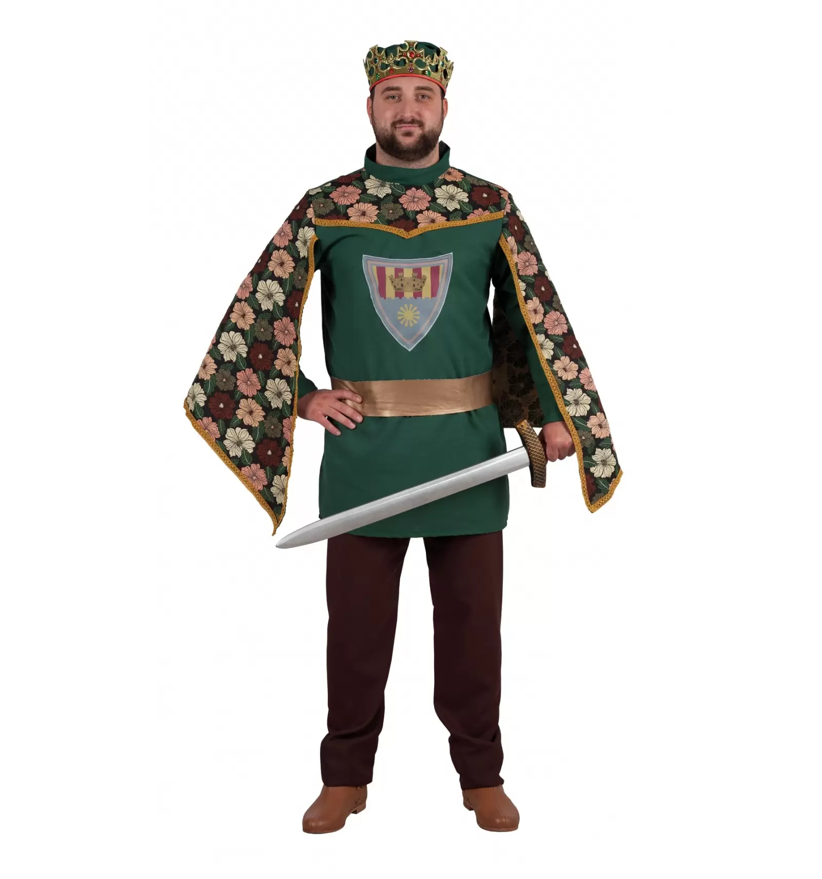 Colorido disfraz de príncipe medieval en color verde con estampado de flores para adulto Incluye pantalón, cinturón, gorro y casaca.