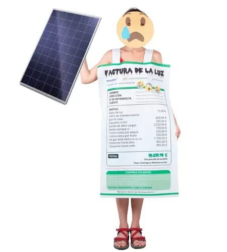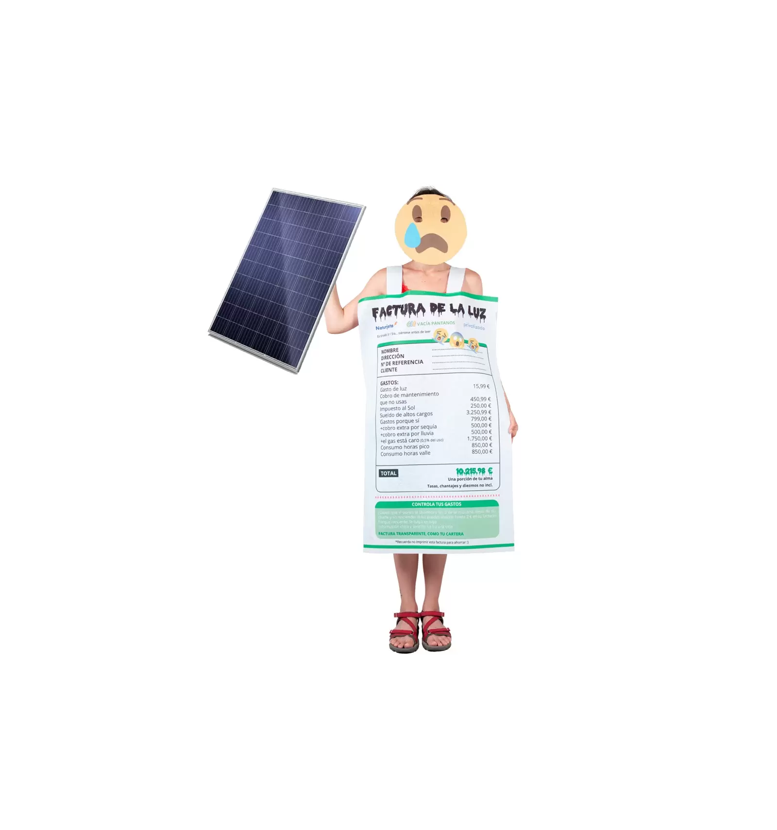 El producto contiene una careta de emoticono triste y un traje que simula la factura de luz, con numerosos detalles graciosos, como una porción de tu alma incluida en tu recibo, aunque no las tasas, chantajes y diezmos... Este ocurrente disfraz está d;/span>isponible en un solo tamaño para adulto, talla 52 y se compone en un 90% de poliéster y en un 10% de otros materiales, por lo que se recomienda no utilizar la lavadora ni la secadora y lavar a mano, en seco y no planchar.