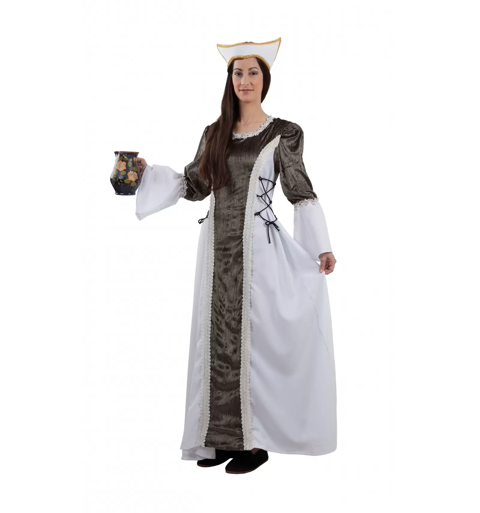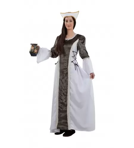 Disfraz Isabel, fabricado en tallas 42 y 48, inlcuye: vestido y tocado.