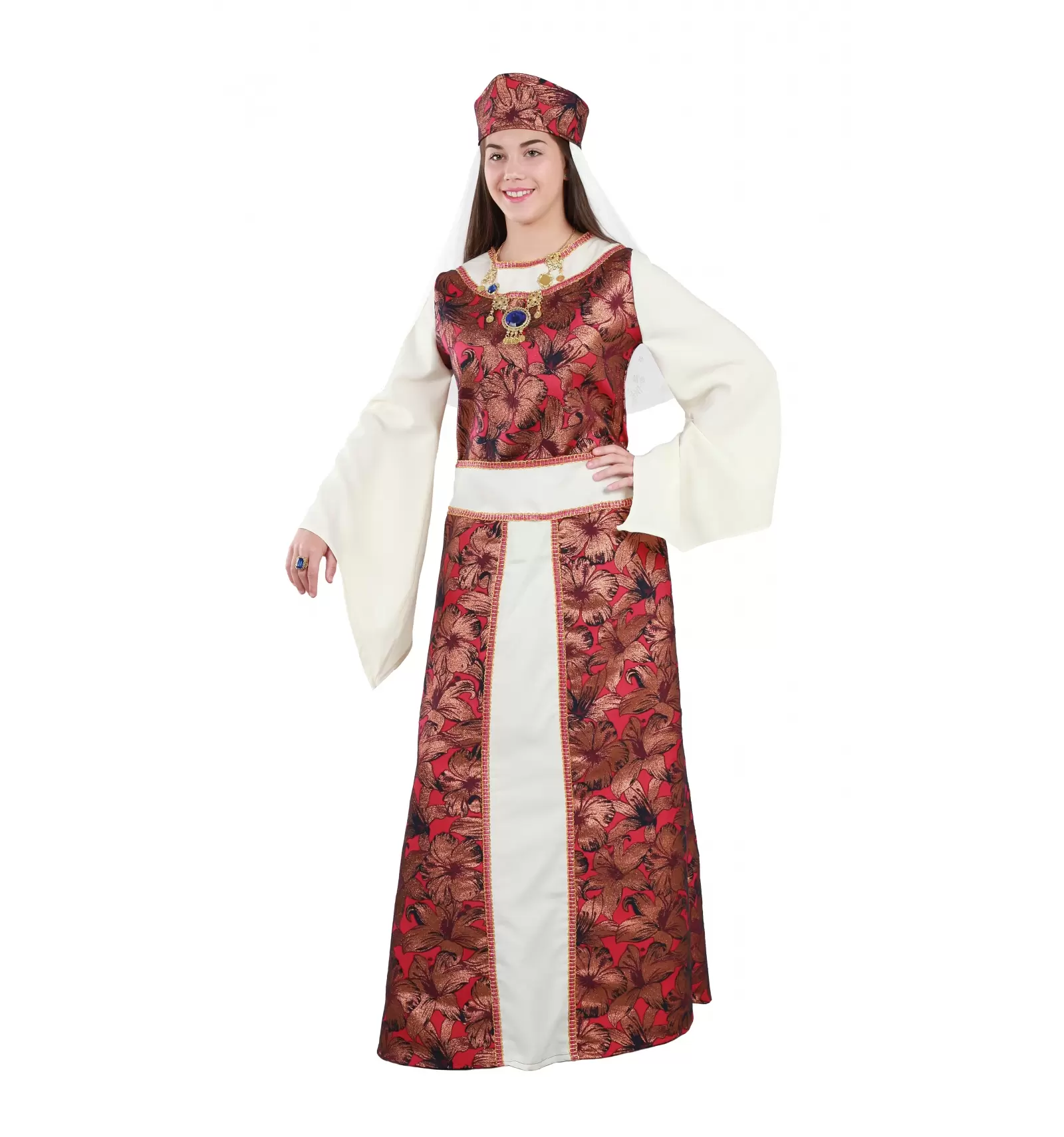 Este elegante y conseguido vestido de reina medieval está disponible en diferentes tallas en nuestro catálogo y será el modelito ideal para la fiesta o mercadillo medieval que tienes en mente.