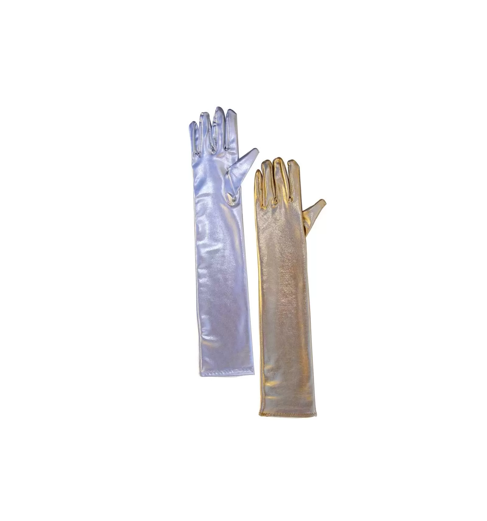 Los guantes metalizados que muestra la imagen están fabricados en tejido tipo lame y en dos colores: Oro y plata.