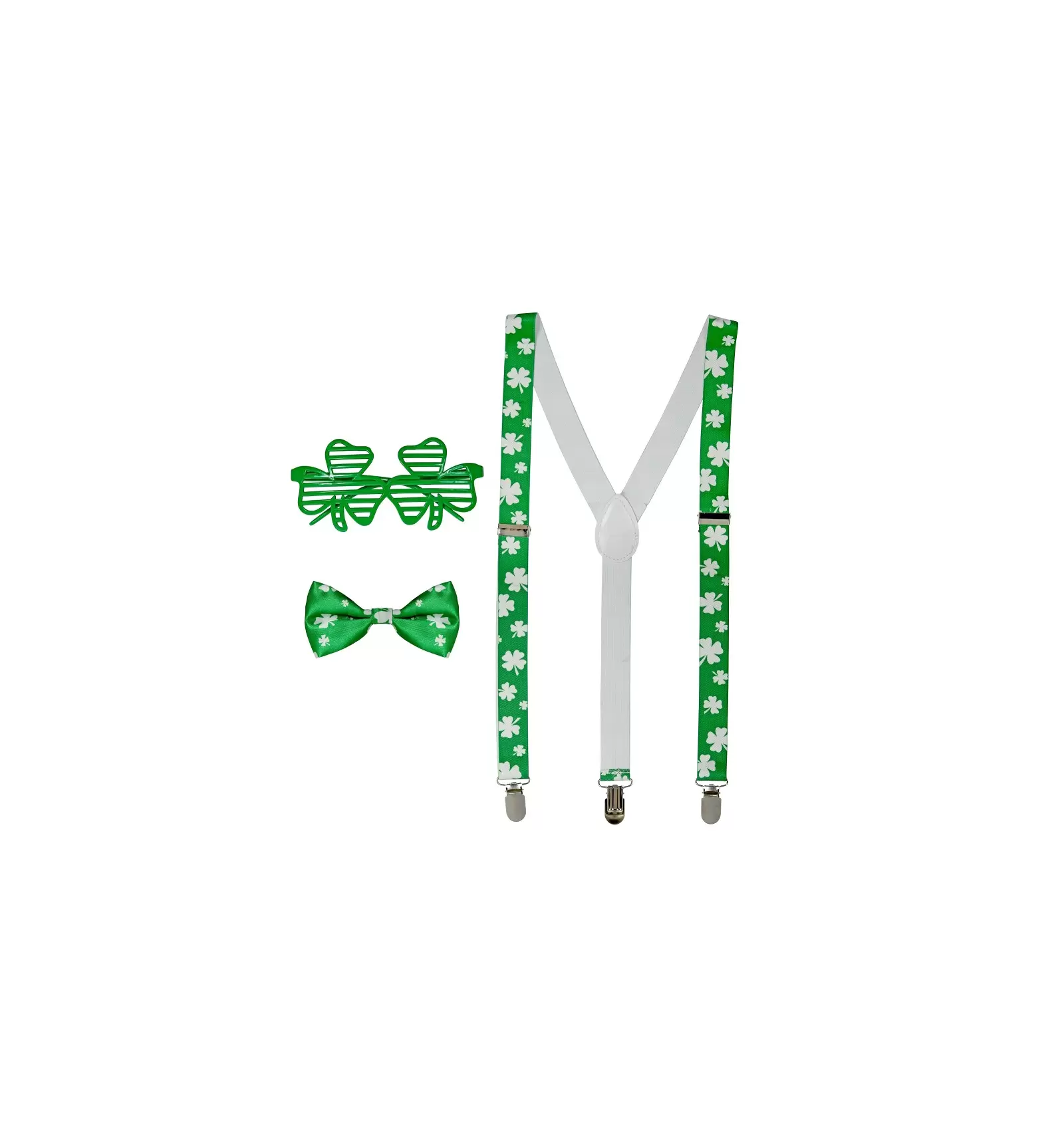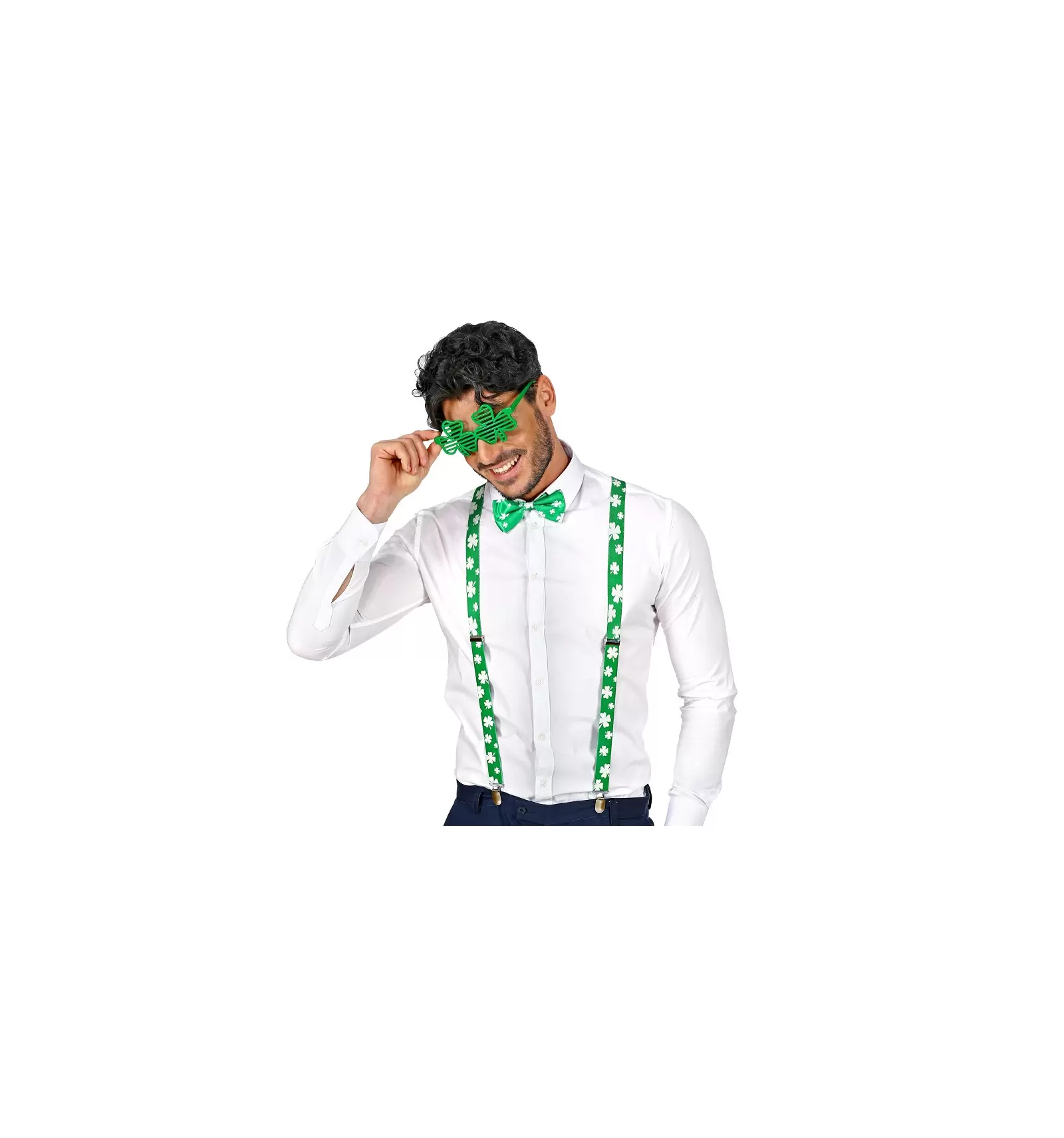 Celebra y disfruta del día de los irlandeses con este llamativo y económico set de San Patricio. El conjunto contiene una pajarita, unas gafas en forma de trébol y unos tirantes, idóneos para ser el protagonista de la próxima fiesta. Siente el espíritu irlandés una vez al año con este magnífico artículo.