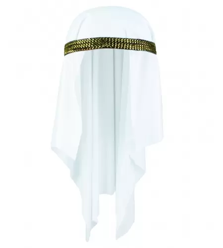 Este nuevo gorro de árabe está disponible en color blanco y contiene una cinta de plástico dorada que ayuda a sujetarlo y le da un toque e color.