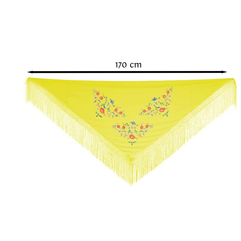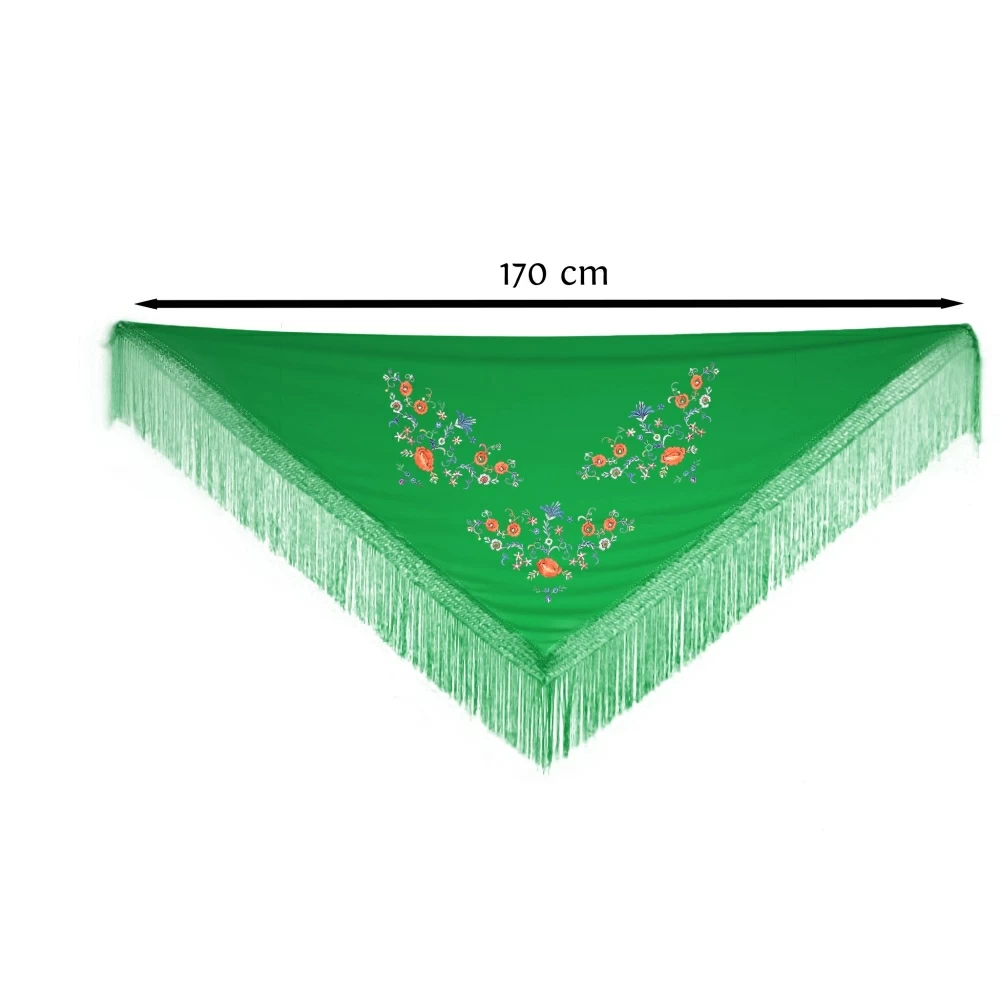 Esta original mantón adulto bordado se encuentra disponible en talla única y en colores verde, amarillo y azul.