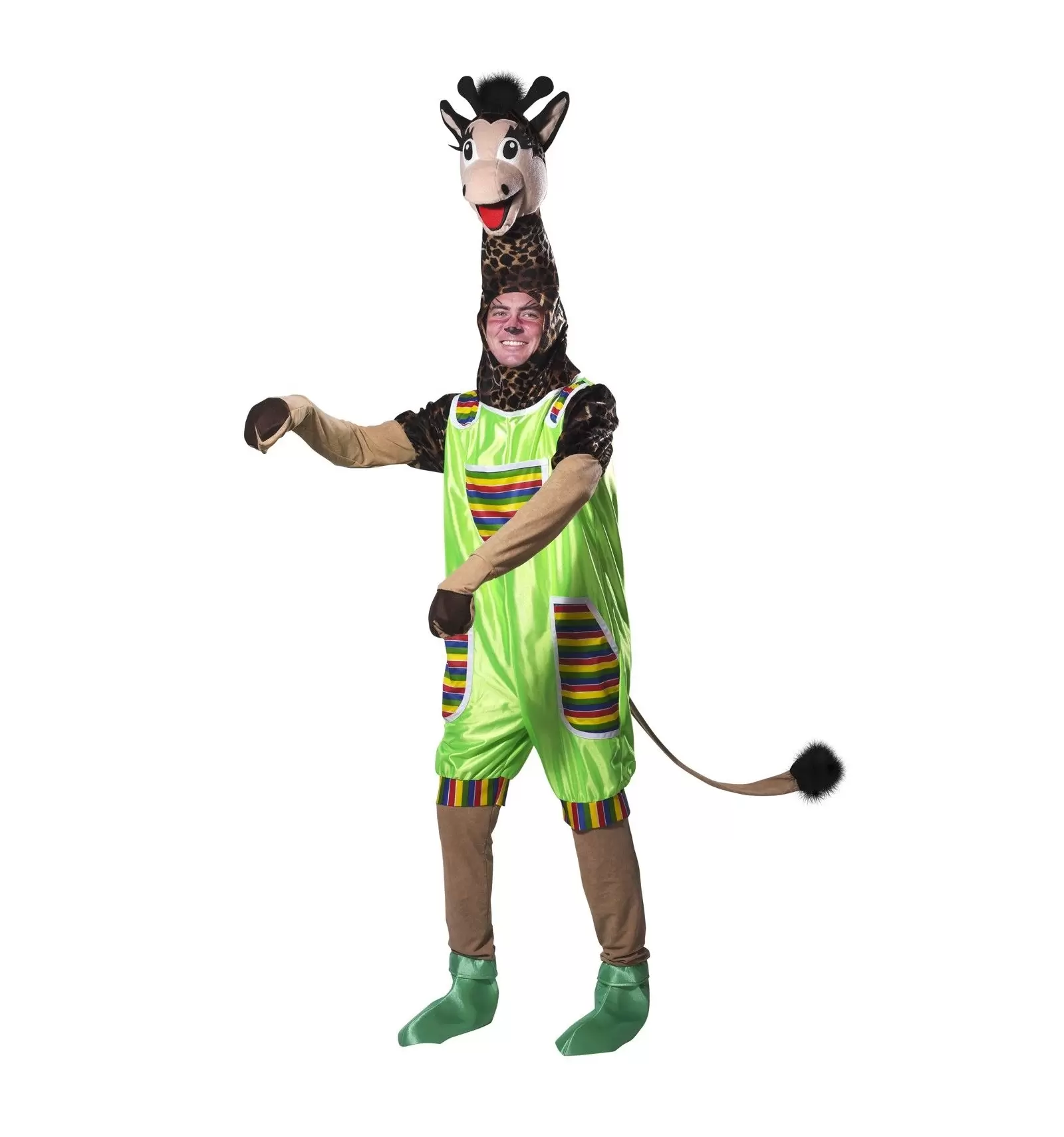LE DEGUISEMENT DE GIRAFE POUR HOMME COMPEND LE PANTALON, LES SUR-BOTTES ET LA TÊTE.