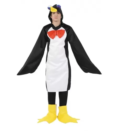 Déguisement de Pingouin en tailles 42 et 52. Il comprend la robe le pantalon, les surbottes et la tête.