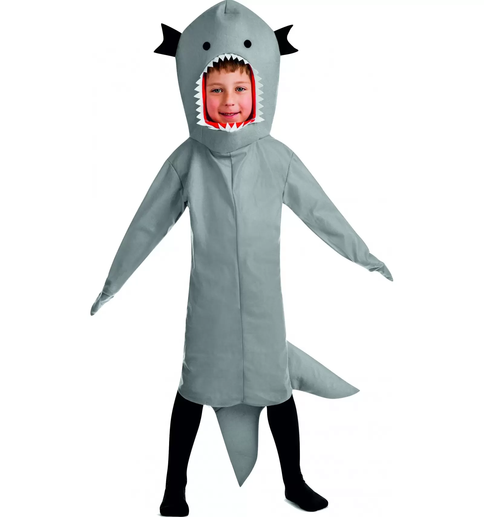 Déguisement de requin disponible en plusieurs tailles, et qui comprend : la combinaison avec la tête et l'ailette avec la queue.