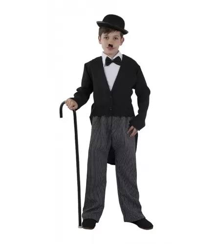 Déguisement de Charlie Chaplin pour enfants comprenant la queue-de-pie, le pantalon et le plastron.