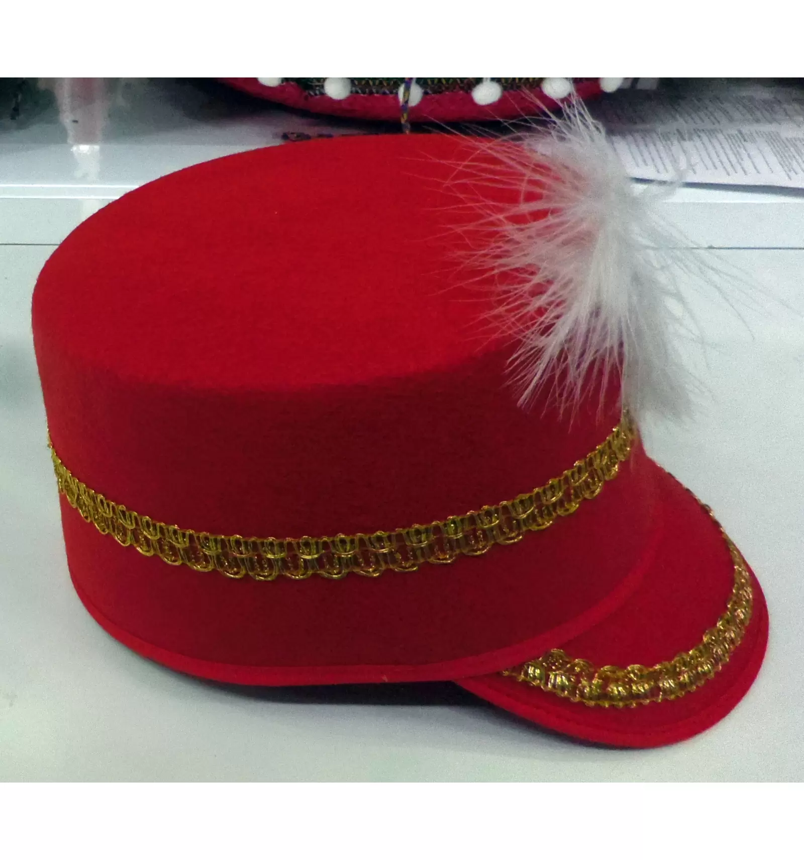 CHAPEAU DE MAJORETTE FABRIQUÉ EN FEUTRE ET DÉCORÉ DE PASSEMENTERIES ET D"UNE PLUME. DISPONIBLE EN COULEUR ROUGE.