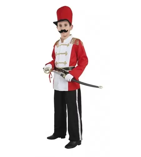 Le déguisement de petit soldat est disponible en 4, 6, 8 et 12 ans, et comprend le chapeau, la veste, le pantalon et la ceinture.