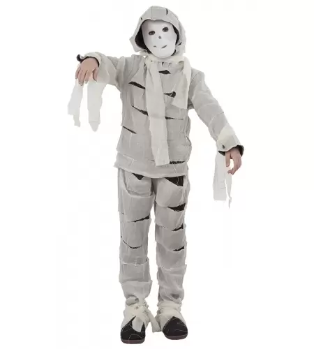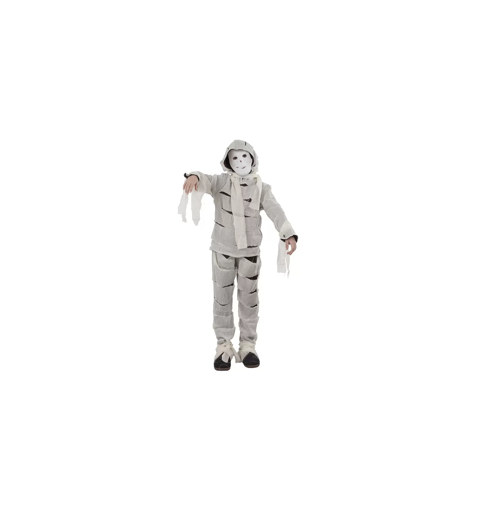 Déguisement de momie adulte qui comprend le tee-shirt avec la capuche, le pantalon et le masque.