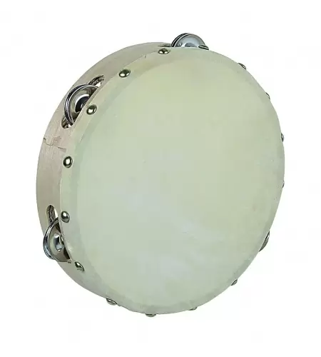 Tambourin en bois et en cuir de 19 cm de diamètre.