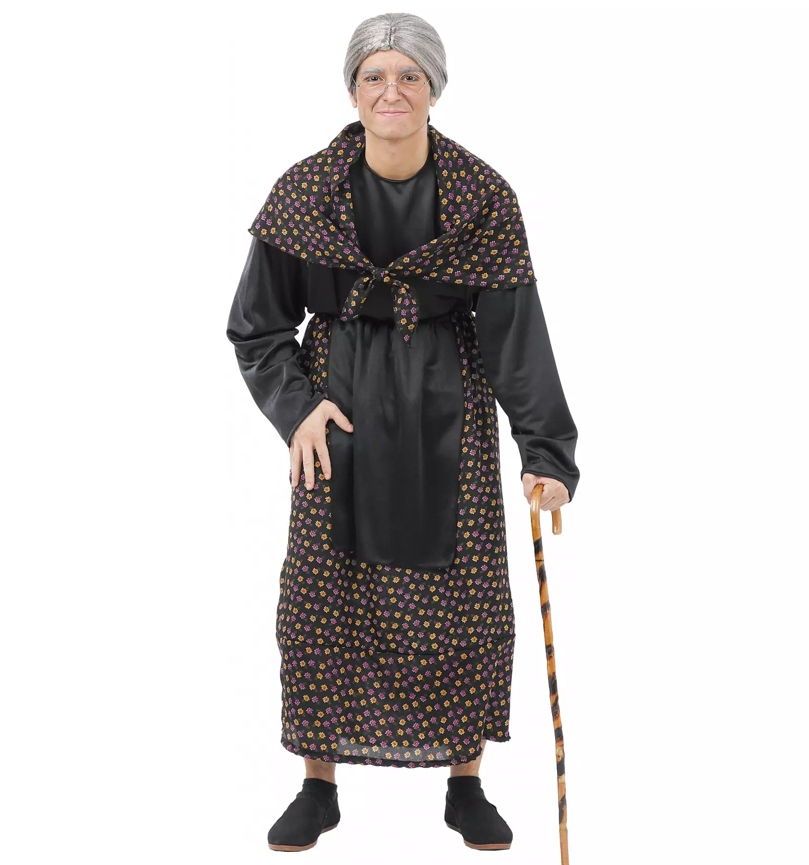 Déguisement vieille femme en tailles 44 pour femmes et 52 pour des hommes. Il comprend foulard, blouse et jupe avec tablier.