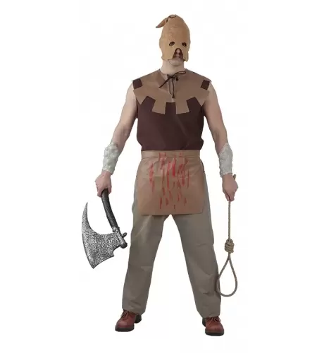 Déguisement de bourreau médiéval qui comprend la capuche, le tee-shirt avec les épaulettes, le tablier, le pantalon et les serre-poignets.