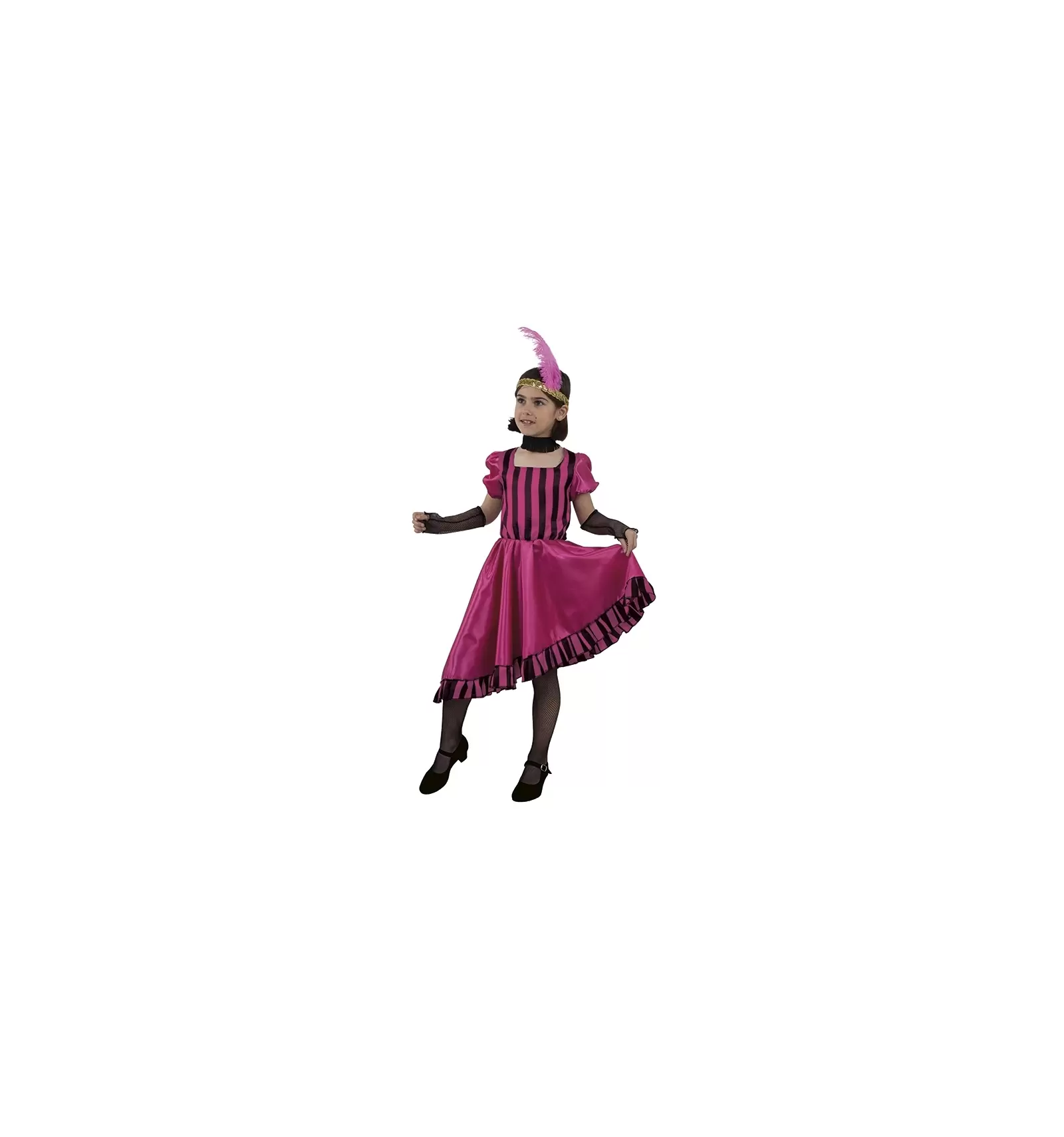 Déguisement cancan pour filles qui comprend la robe, la coiffe et les manchettes.