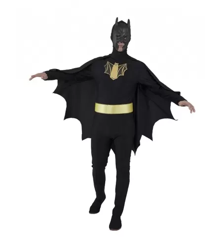 Déguisement de superhéros chauve-souris pour hommes qui comprend le masque, la combinaison avec la cape et la ceinture.