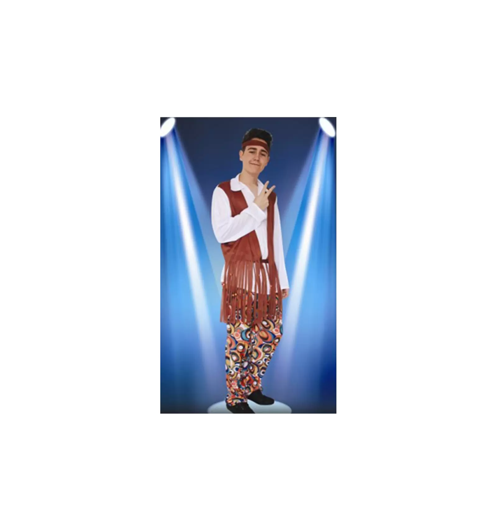 DÉGUISEMENT HIPPIE DISPONIBLE EN TAILLE M ET QUI COMPREND : LE PANTALON, LA CHEMISE, LE GILET ET LES RUBANS.