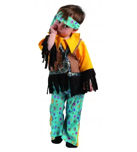 Déguisement hippie garçon bébé en tailles 2 et 4 ans. Il comprend la chemise, le gilet, le pantalon, la ceinture et le bandeau.